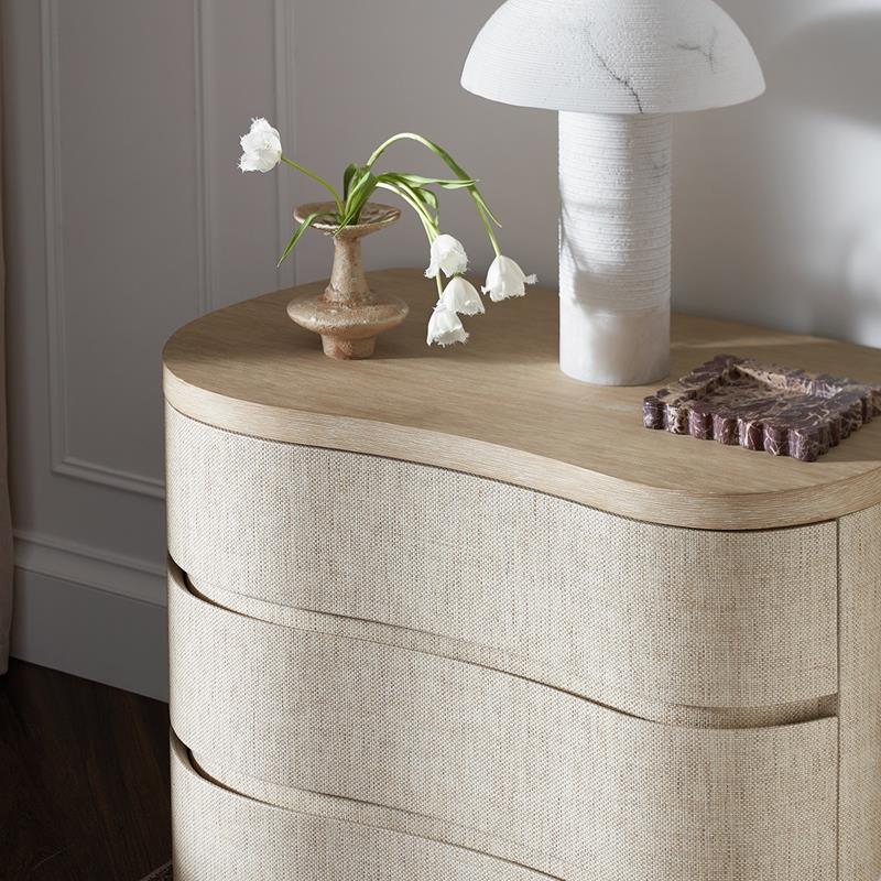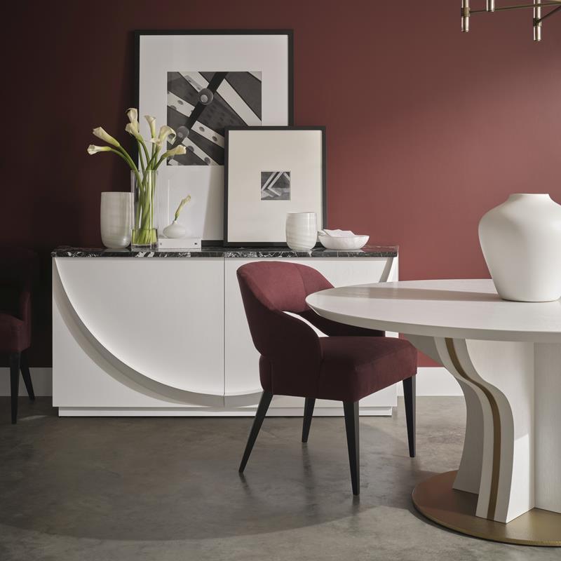 With a generous dose of mid-century appeal, the 30-piece Brasea collection combines clean lines and sleek profiles with visually stunning materials. Part of the smaller scale Loft line, the aesthetic is minimalist but warm. A rich, organic finish on suar wood veneers creates striking cathedrals, mineral streaks and bold contrast in the grain. Suar is a fast-growing tree known in Southeast Asia as well as throughout South and Central America as the “rain tree.” Woven raffia adds texture on drawer fronts, cabinet doors and a generously scaled console. Sculptural upholstery on a smaller scale highlights the modernist perspective.  Also new is the 38-piece Geneve collection made in white oak veneers and available in two finishes, a lighter Alba and a darker Robor. It has a modern-casual design with soft edges and reeded accents. www.bernhardt.com
